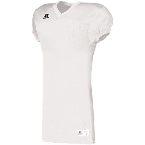 Russell Athletic Football Jersey W/Side Panels Strength and comfort come together in the Russell Athletic Solid Jersey With Side Inserts. 93 Cloth mesh is tough and breathable, and its skill cut 73 Cloth sleeves give this football jersey complete pad coverage. 100% nylon (colors), 100% polyester (white) tricot mesh. Reinforced 73 cloth yoke for added durability in contact area. Skill cut 73 cloth sleeves for complete pad coverage. 62 cloth side and under sleeve insert for tailored fit. Outside locker label. V-neck collar. Set-in sleeves.