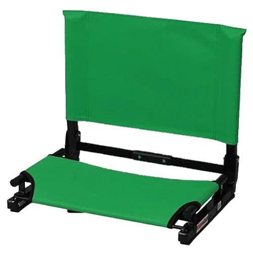 Stadium Chair Bleacher Seat Patented bungee-cord cushioning. Durable steel frame. Heavy Cordura canvas seat and back rest. Hinged back support for added comfort. Bottom hooks to secure to bleacher. Folds neatly for easy carry and storage. Optional chair legs and arm rests for versatile seating. Deluxe version not available in Kelly Green, Brown, Columbia, Gold or Pink.