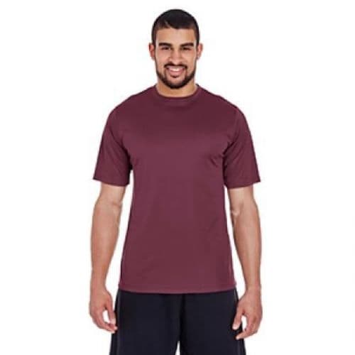 100% Polyester interlock with moisture-wicking and UV protection performance. Features an Athletic fit, heat-sealed label, and cationic dyes to ensure brightness and excellent fastness.