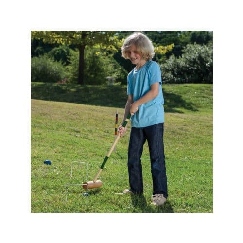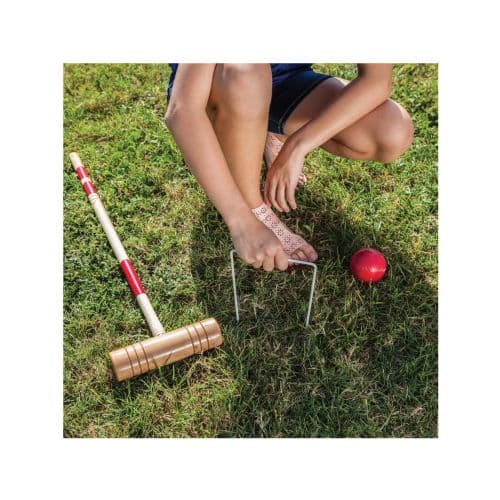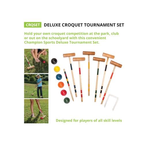 - Deluxe set includes 6 solid hardwood mallets, 6 brightly colored poly-resin balls, 2 solid hardwood end posts, and 9 vinyl-coated heavy duty steel wickets