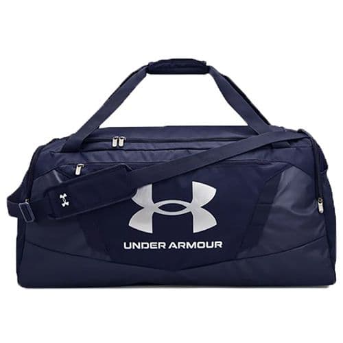 UA Undeniable 5.0 Large Duffle UA Storm technology delivers an element-battling, highly water-repellent finish. Tough, PU-coated and foam-lined bottom and side panels for added durability and structure. Dual water bottle slip pocket and right-side zippered valuables pocket. Large vented pocket for laundry or shoes and internal pockets for organization. Large front zippered organization pocket and molle web attachment points. Removable, padded, Heatgear shoulder strap easily in side pocket. Back of duffle is blank for easy embellishment.